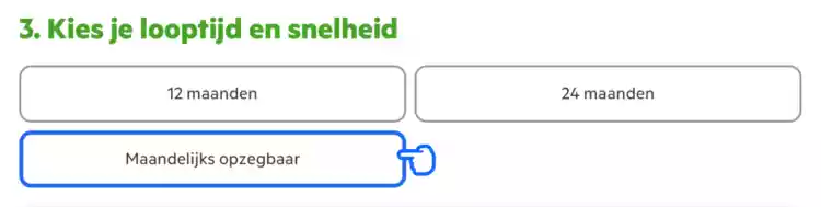 Je kunt tijdelijk internet van KPN eenvoudig aanvragen in het bestelproces door ‘maandelijks opzegbaar’ te selecteren, in plaats van de standaard looptijd van 12 of 24 maanden maanden.