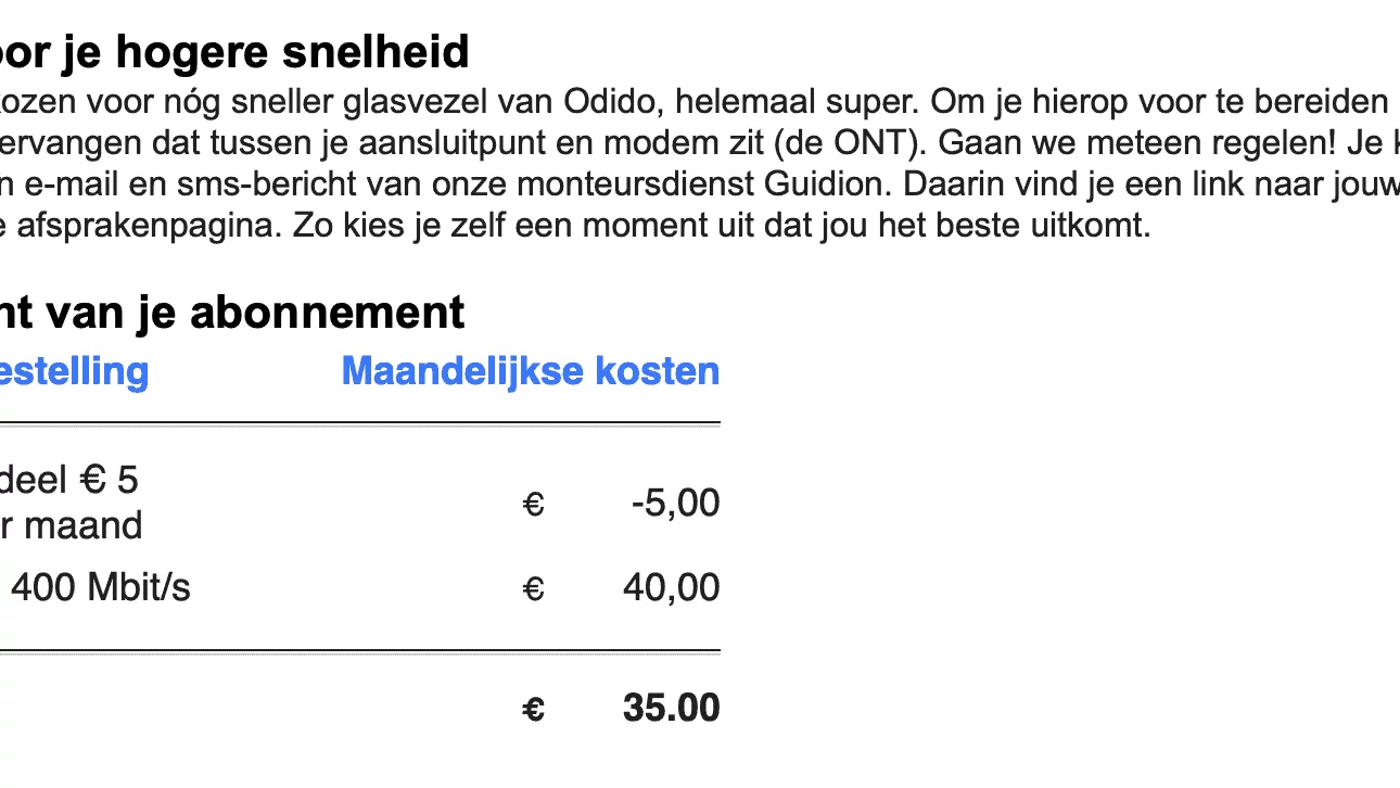 - 'Je Odidio abonnement is aangepast' krijg je te zien. Je krijgt ook een e-mail van Odido. Soms staat erin dat er een nieuw modem nodig is. Dit kun je negeren.