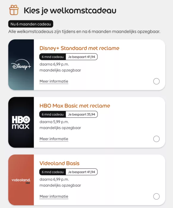 Naast deze korting krijg je nu ook 6 maanden een gratis streamingdienst naar keuze: Disney+ Standaard ,HBO Max Standaard of Videoland Basis. Met deze extra deal loopt de totale waarde van je voordeel op met nog eens € 42,-.